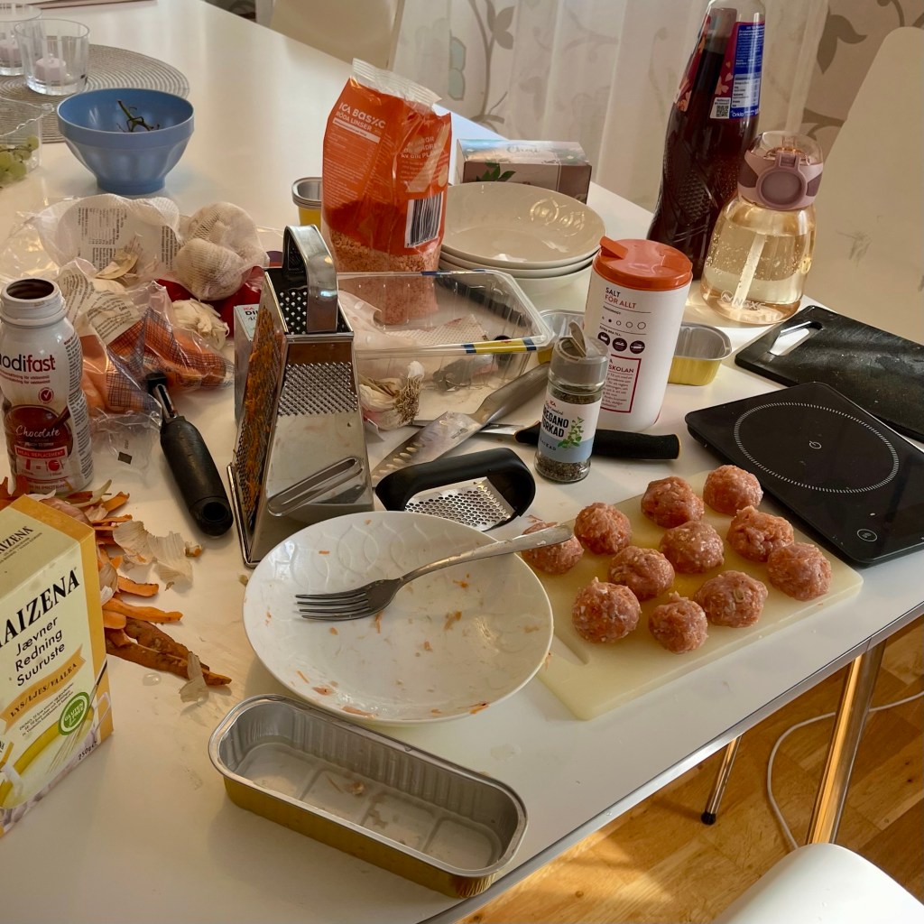 Sen blev det kycklingbollar på kycklingfärs, vitlök, rivna morötter och lök, kokade i kokosmjölk med asiatiska smaker. Doften i köket var magisk, och känslan av att få skapa något gott och närande gav mig energi.